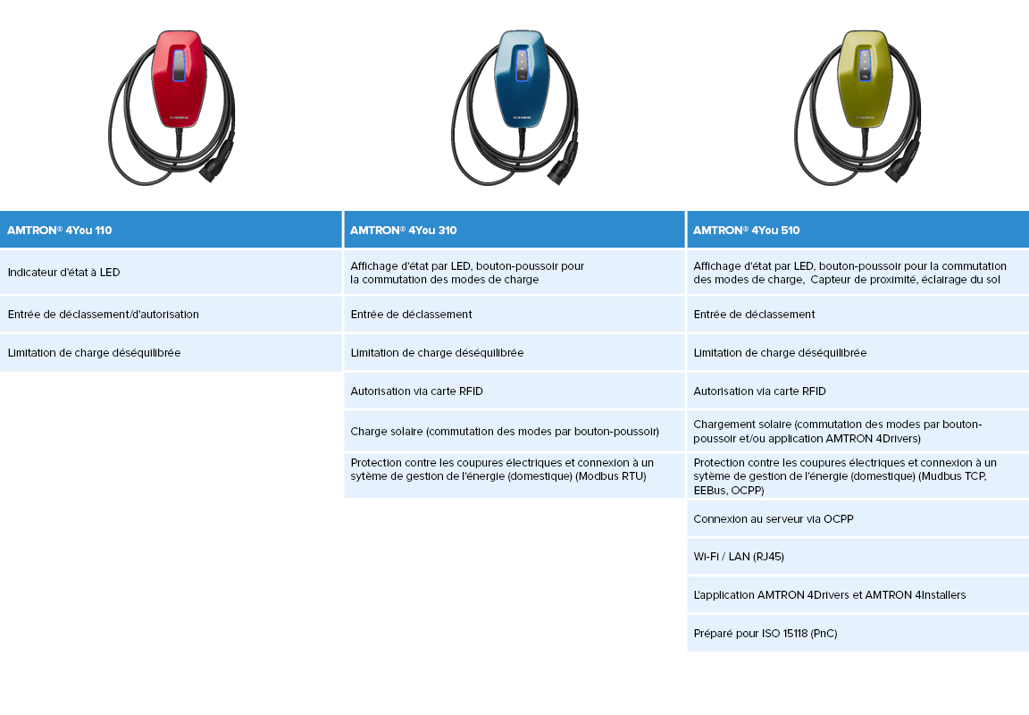 Bienvenue dans la famille AMTRON® 4You, qui couvre toute la diversité des solutions de recharge, du plus simple au plus connecté, pour s’adapter parfaitement à vos attentes. La commande peut se faire soit par simple bouton, soit confortablement via une application mobile. Spécialement conçues pour la recharge à domicile, nos bornes murales offrent un ensemble complet et bien pensé avec trois séries : AMTRON® 4You 100, 300 et 500.