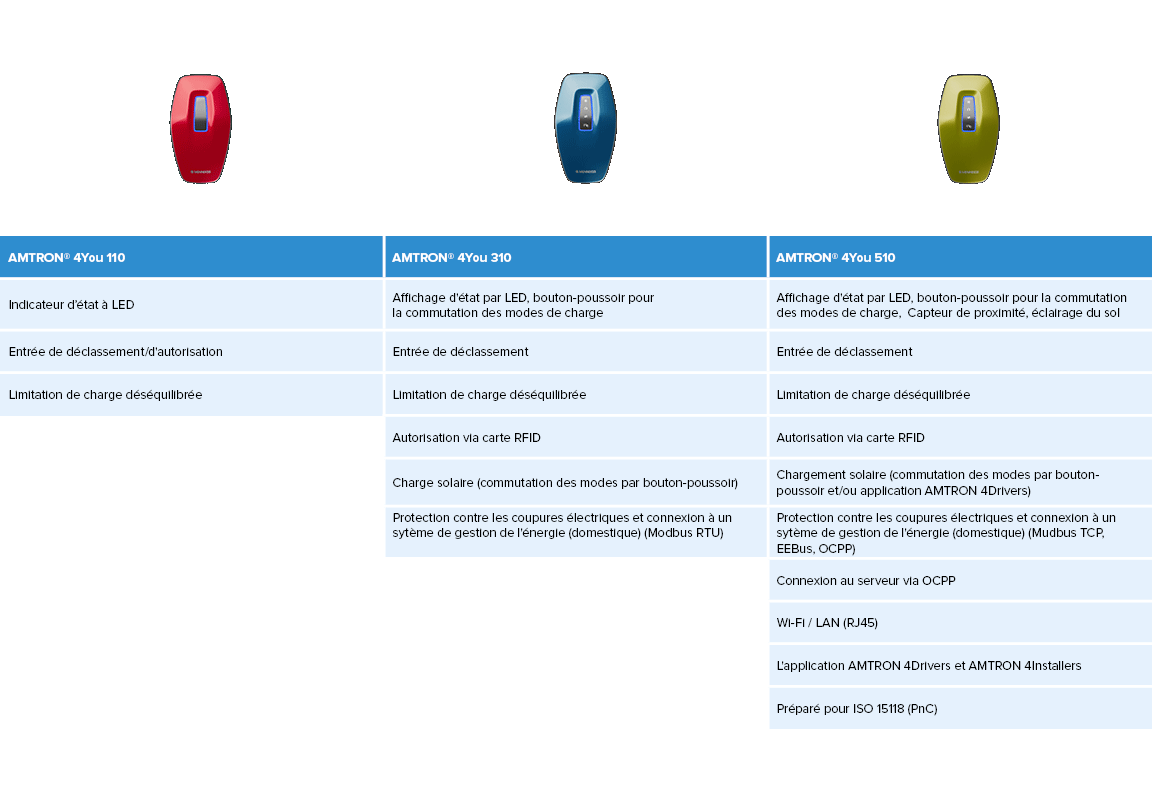 Bienvenue dans la famille AMTRON® 4You, qui couvre toute la diversité des solutions de recharge, du plus simple au plus connecté, pour s’adapter parfaitement à vos attentes. La commande peut se faire soit par simple bouton, soit confortablement via une application mobile. Spécialement conçues pour la recharge à domicile, nos bornes murales offrent un ensemble complet et bien pensé avec trois séries : AMTRON® 4You 100, 300 et 500.