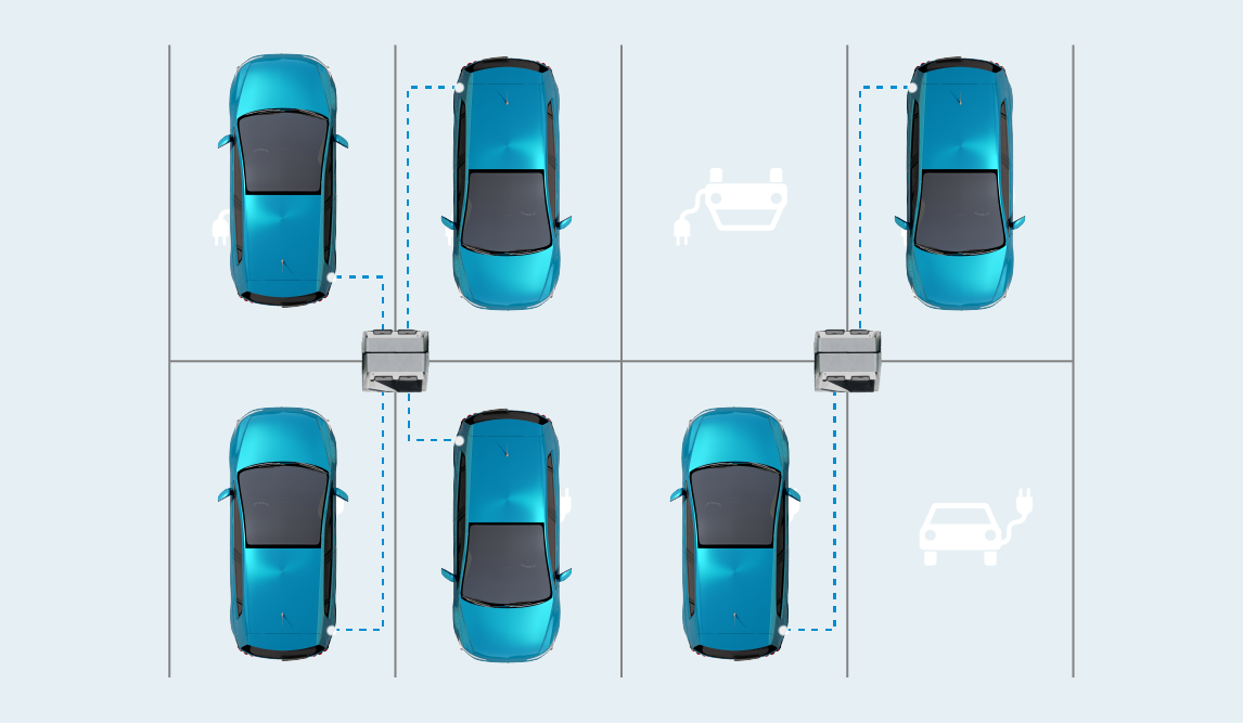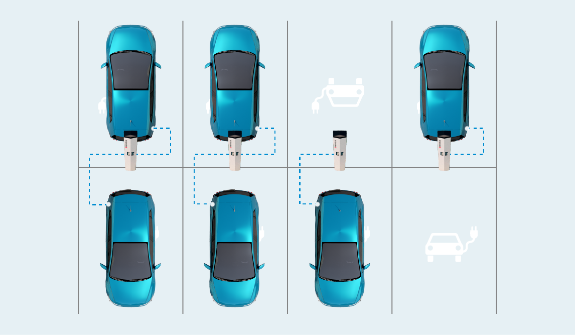 Exemple : huit points de charge répartis sur quatre bornes de recharge AMEDIO® Professional.