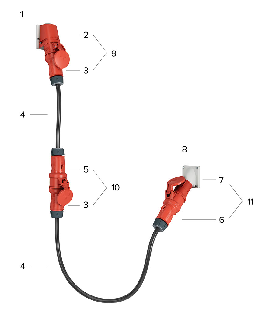 Les noms de nos dispositifs de connexion sont attribués conformément à la norme CEI 60309-1 (la norme internationale pour les fiches et prises, les prolongateurs de câbles et les dispositifs de connexion d‘appareils) :
